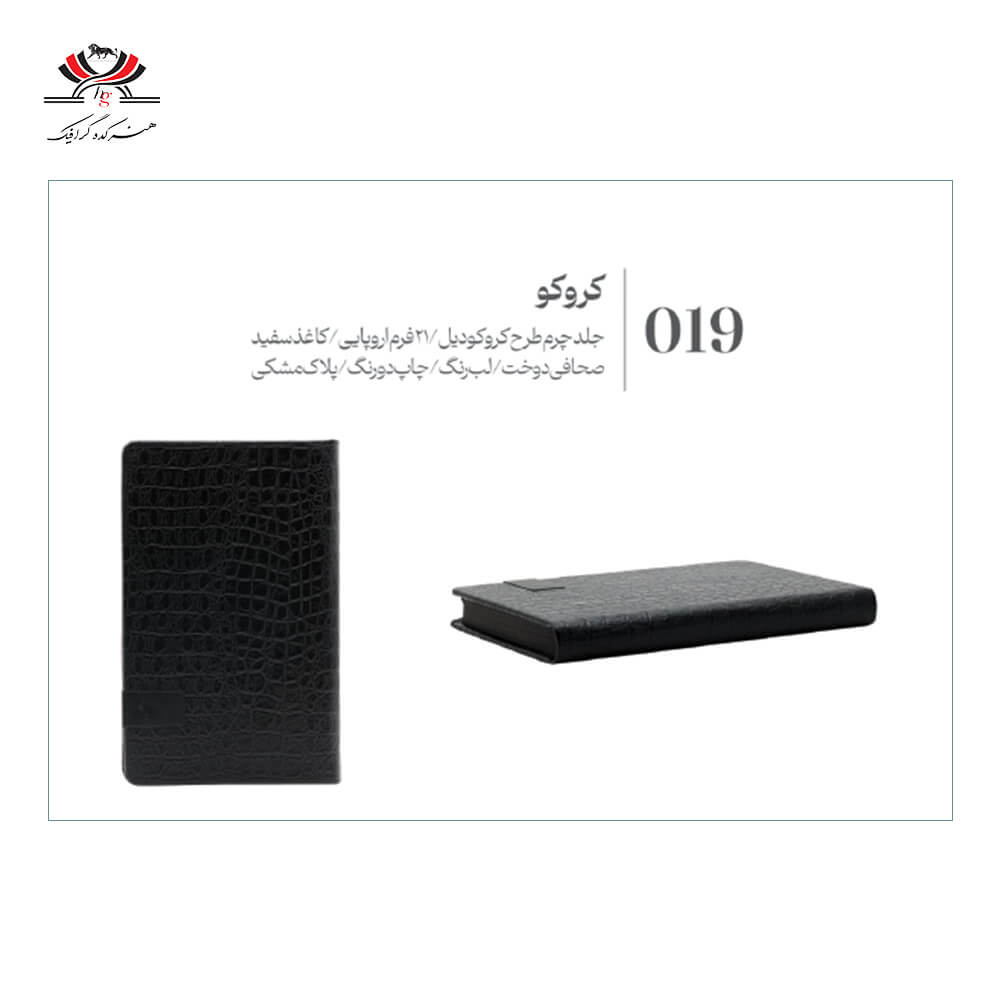 سررسید اروپایی مدل GE19 با جلد چرم طرح کروکودیل، طراحی خاص و مدیریتی، صحافی دوخت و چاپ دو رنگ؛ انتخابی حرفهای برای برنامهریزی روزانه و هدیههای سازمانی.