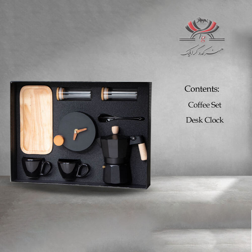یک پک تبلیغاتی خاص و متفاوت است که با ترکیب ست قهوه و ساعت رومیزی، تجربهای گرم، کاربردی و زیبا را برای هدیههای سازمانی، شرکتی و شخصی فراهم میکند. این محصول با طراحی مینیمال، رنگبندی مشکی و جزئیات چوبی، جلوهای مدرن و لوکس دارد که مناسب فضاهای کاری، خانگی یا دکورهای خاص است.